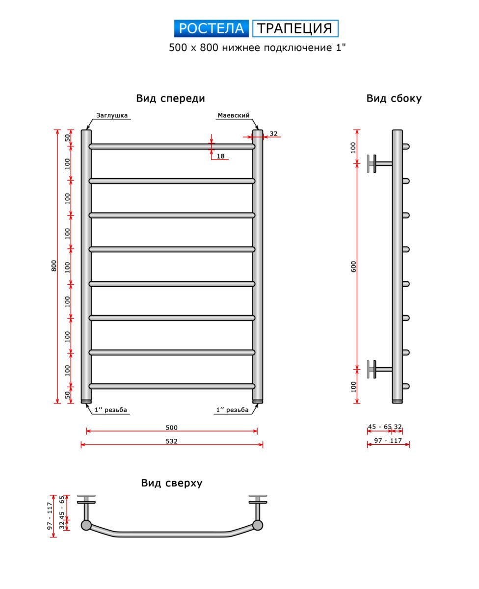 Полотенцесушитель Ростела Трапеция (нижн.подв., 1" резьба) 500 х 800 / 8