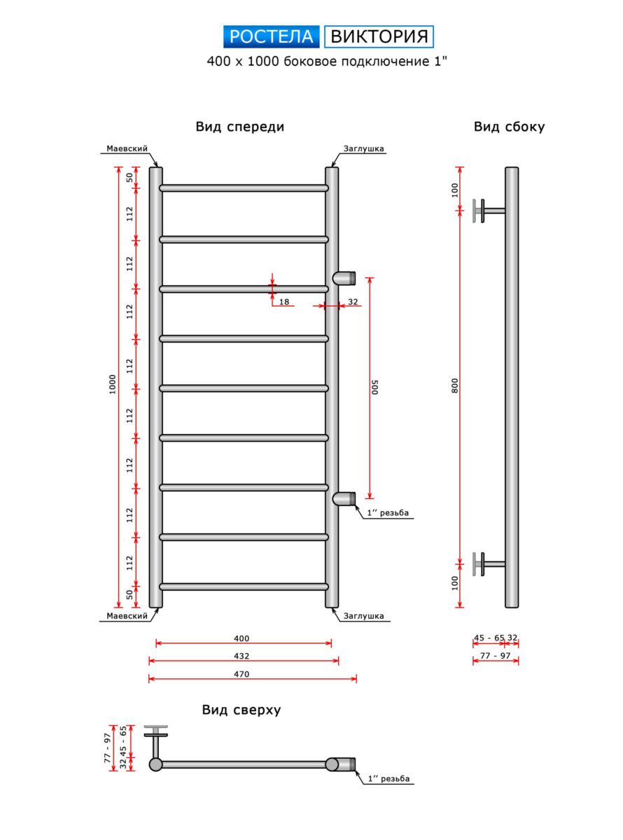 Полотенцесушитель Ростела Виктория (бок.подв., 1" резьба) 400 х 1000 / 9