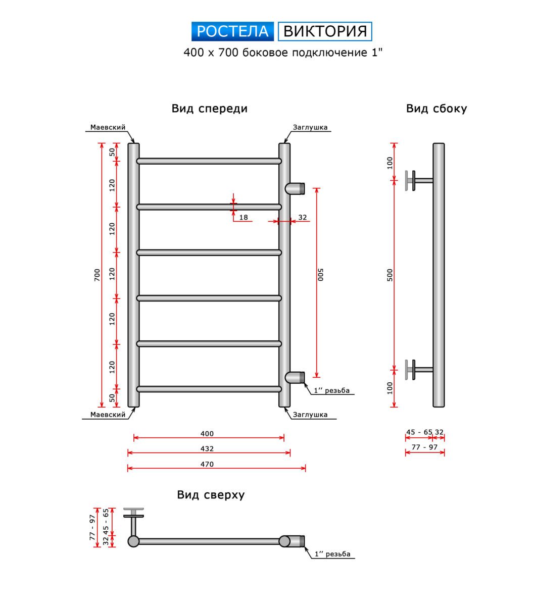 Полотенцесушитель Ростела Виктория (бок.подв., 1" резьба) 400 х 700 / 6