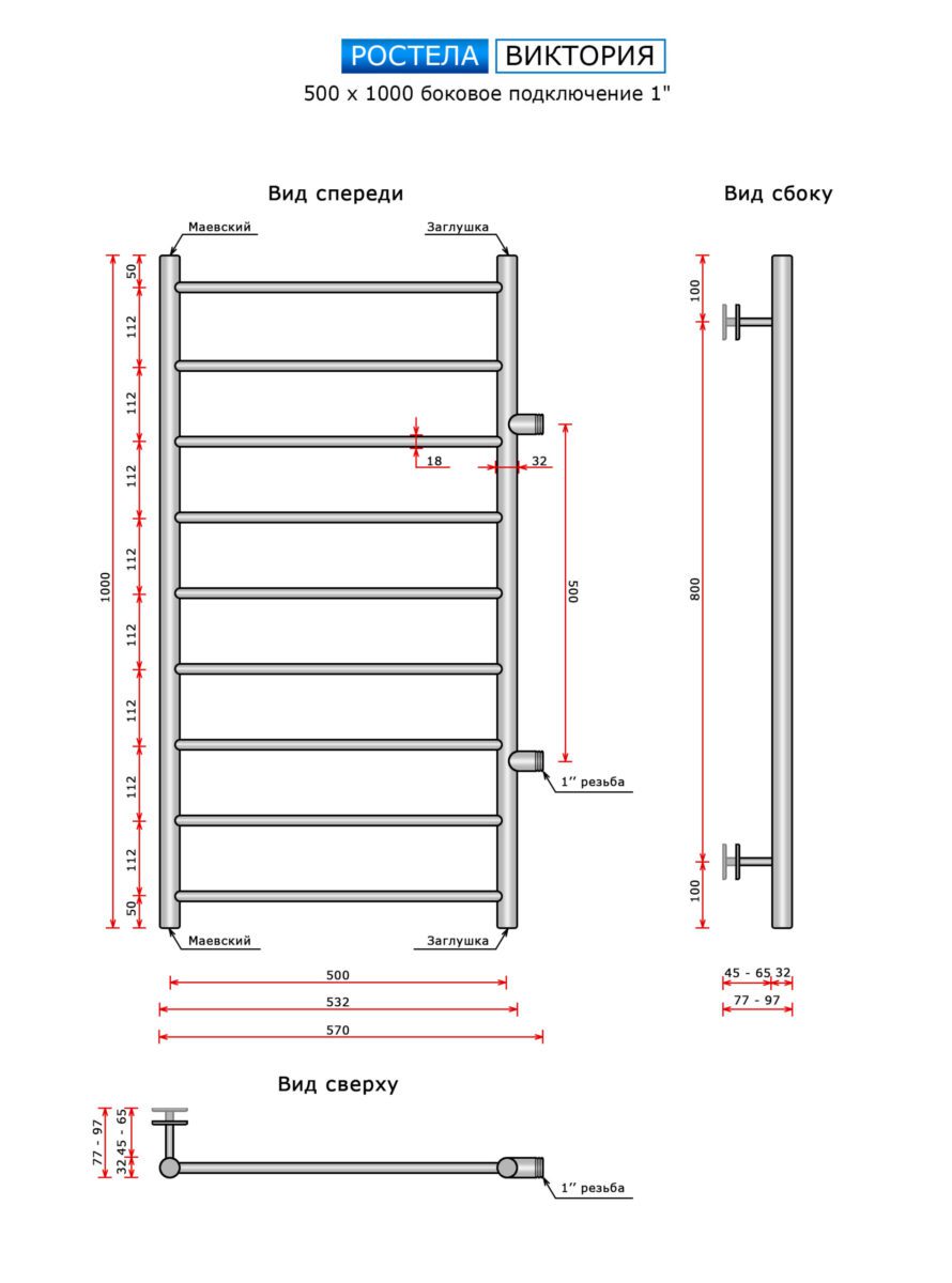 Полотенцесушитель Ростела Виктория (бок.подв., 1" резьба) 500 х 1000 / 9