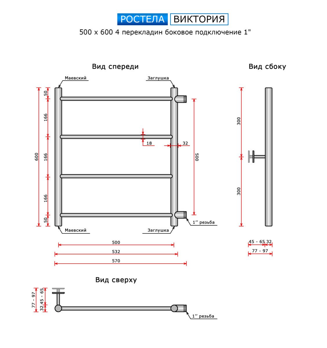 Полотенцесушитель Ростела Виктория (бок.подв., 1" резьба) 500 х 600/ 4