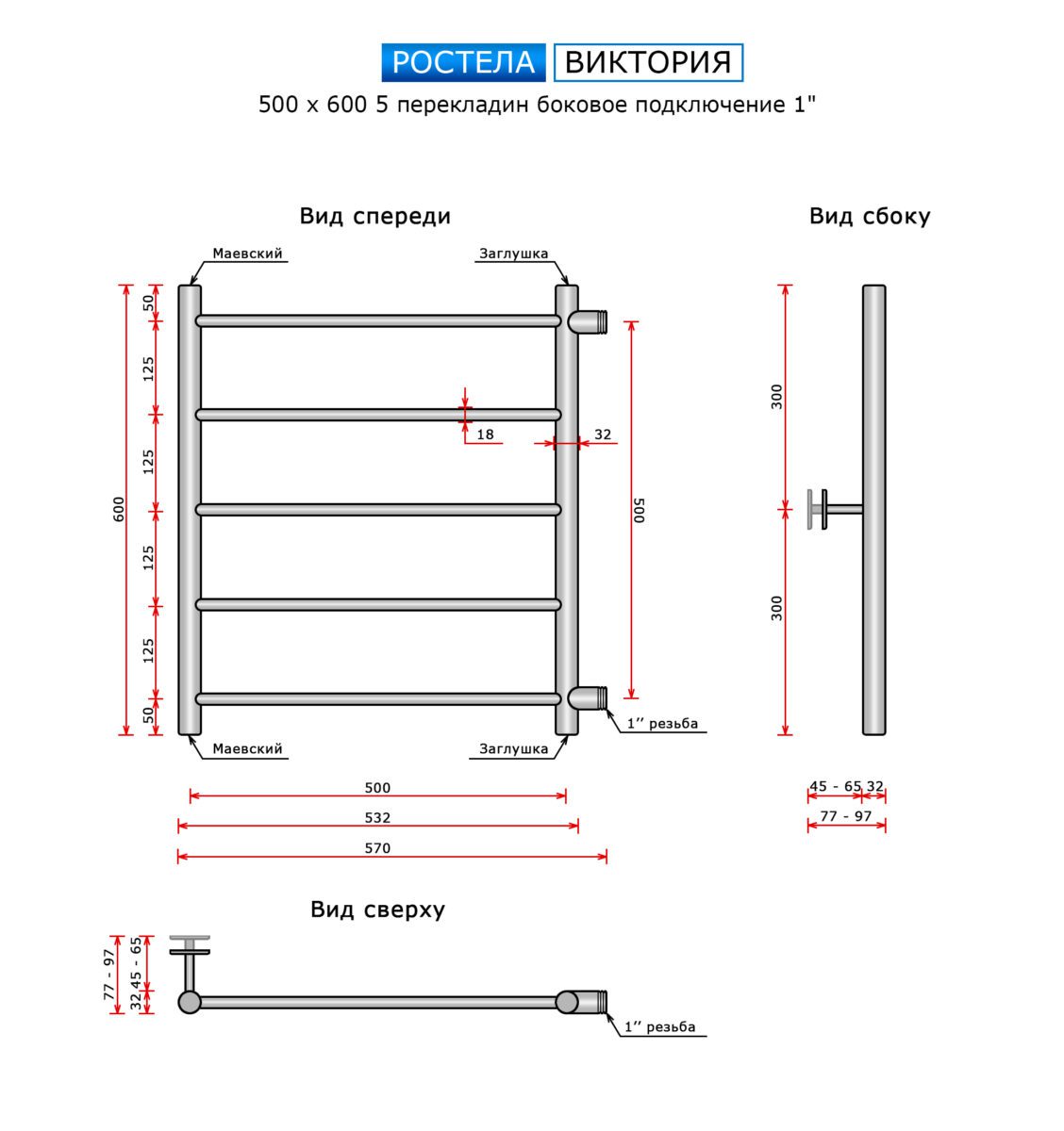 Полотенцесушитель Ростела Виктория (бок.подв., 1" резьба) 500 х 600 / 5