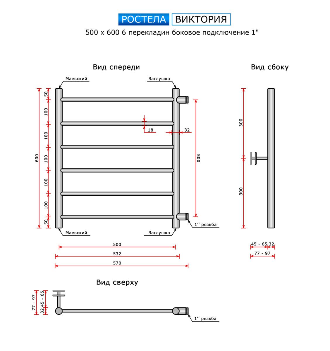 Полотенцесушитель Ростела Виктория (бок.подв., 1" резьба) 500 х 600 / 6
