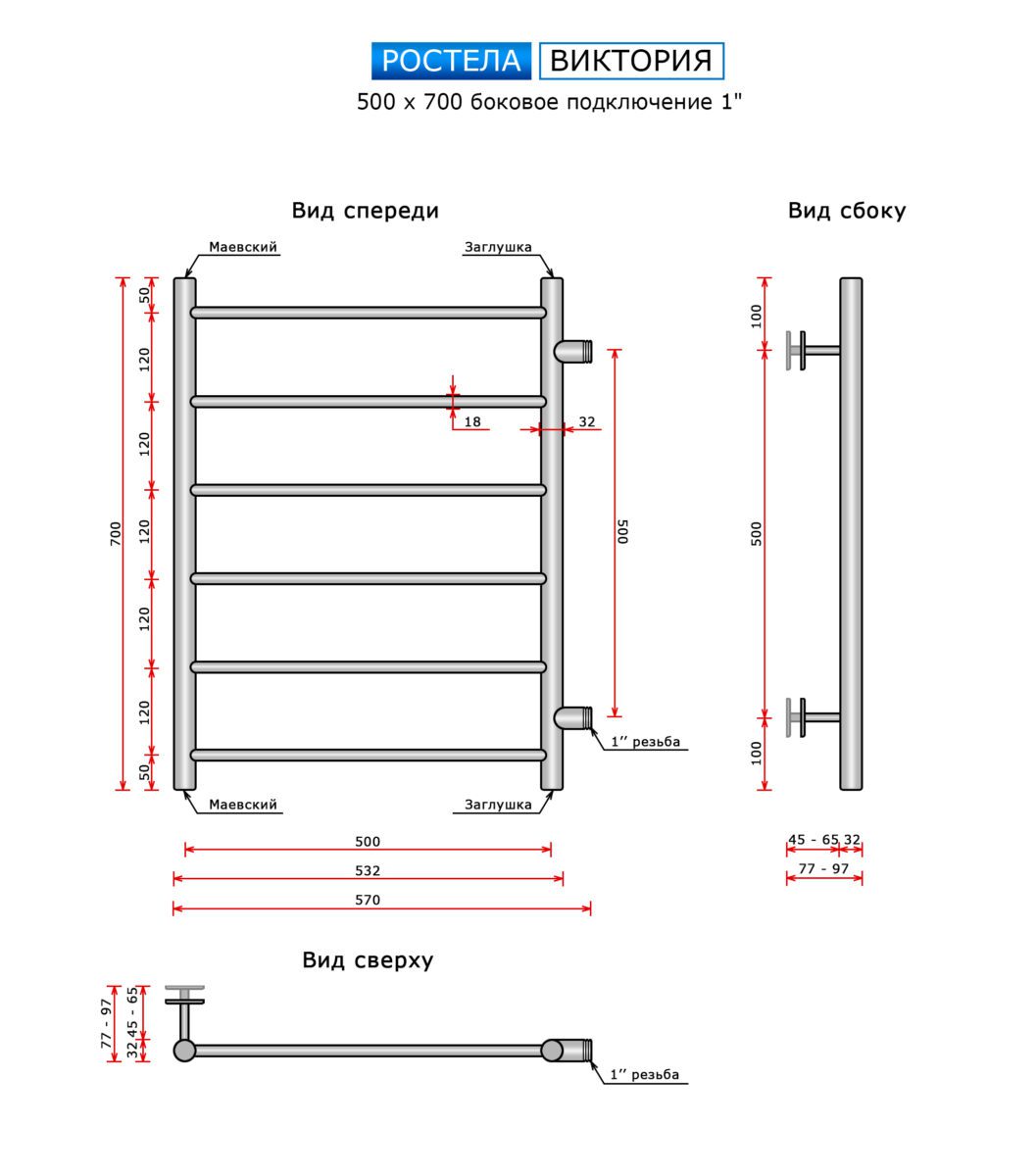 Полотенцесушитель Ростела Виктория (бок.подв., 1" резьба) 500 х 700 / 6