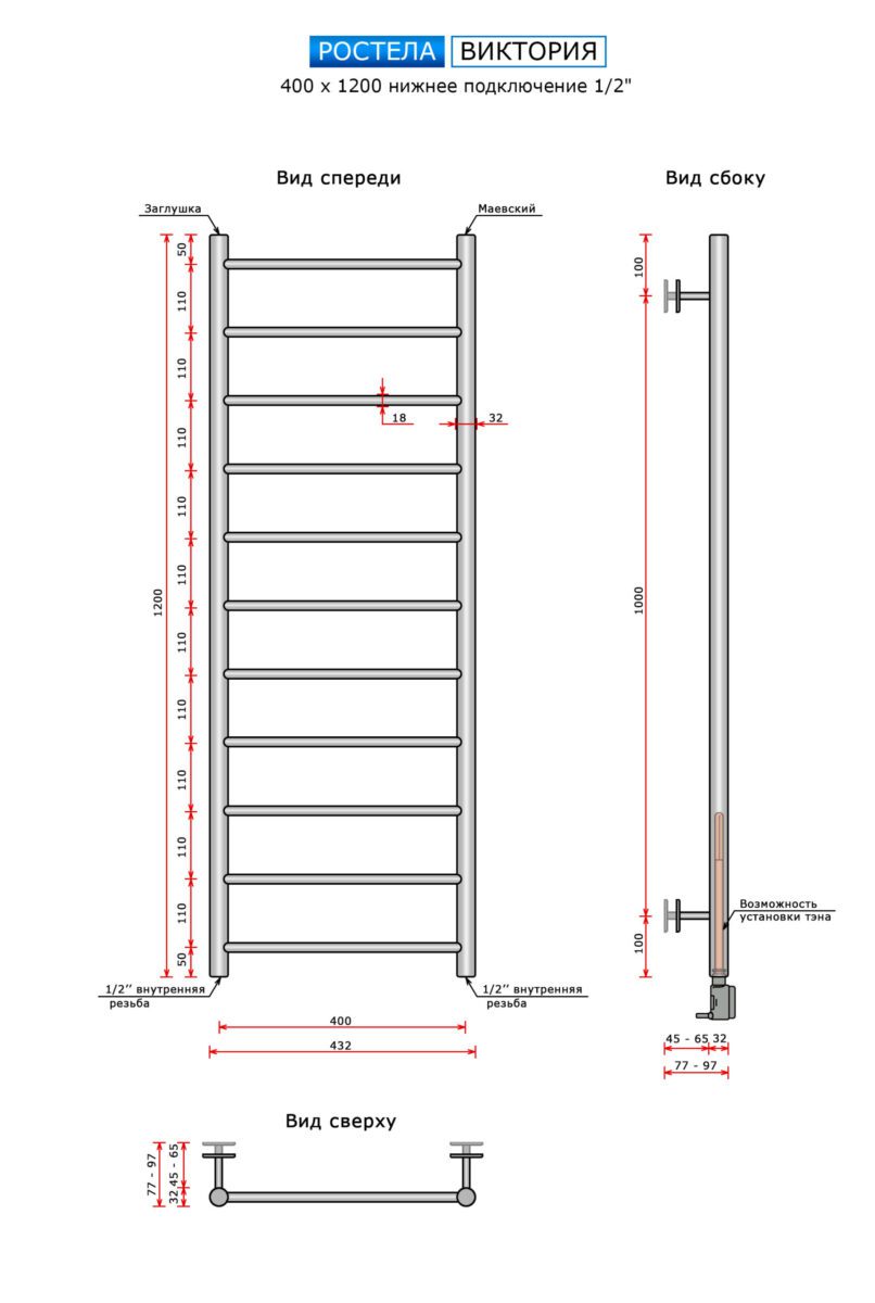 Полотенцесушитель Ростела Виктория (нижн,подв, 1/2" резьба) 400 x 1200 / 11