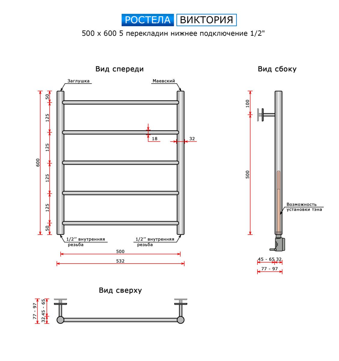 Полотенцесушитель Ростела Виктория (нижн,подв, 1/2" резьба) 500 x 600 / 5