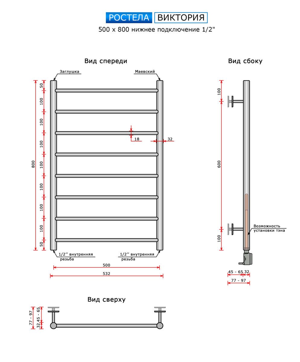 Полотенцесушитель Ростела Виктория (нижн,подв, 1/2" резьба) 500 x 800 / 8