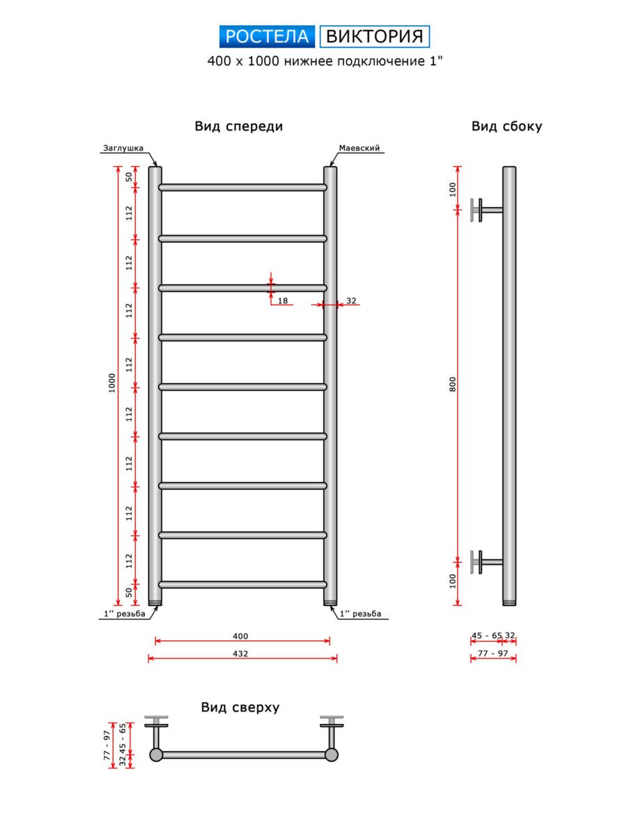 Полотенцесушитель Ростела Виктория (нижн,подв, 1" резьба) 400 x 1000 / 9