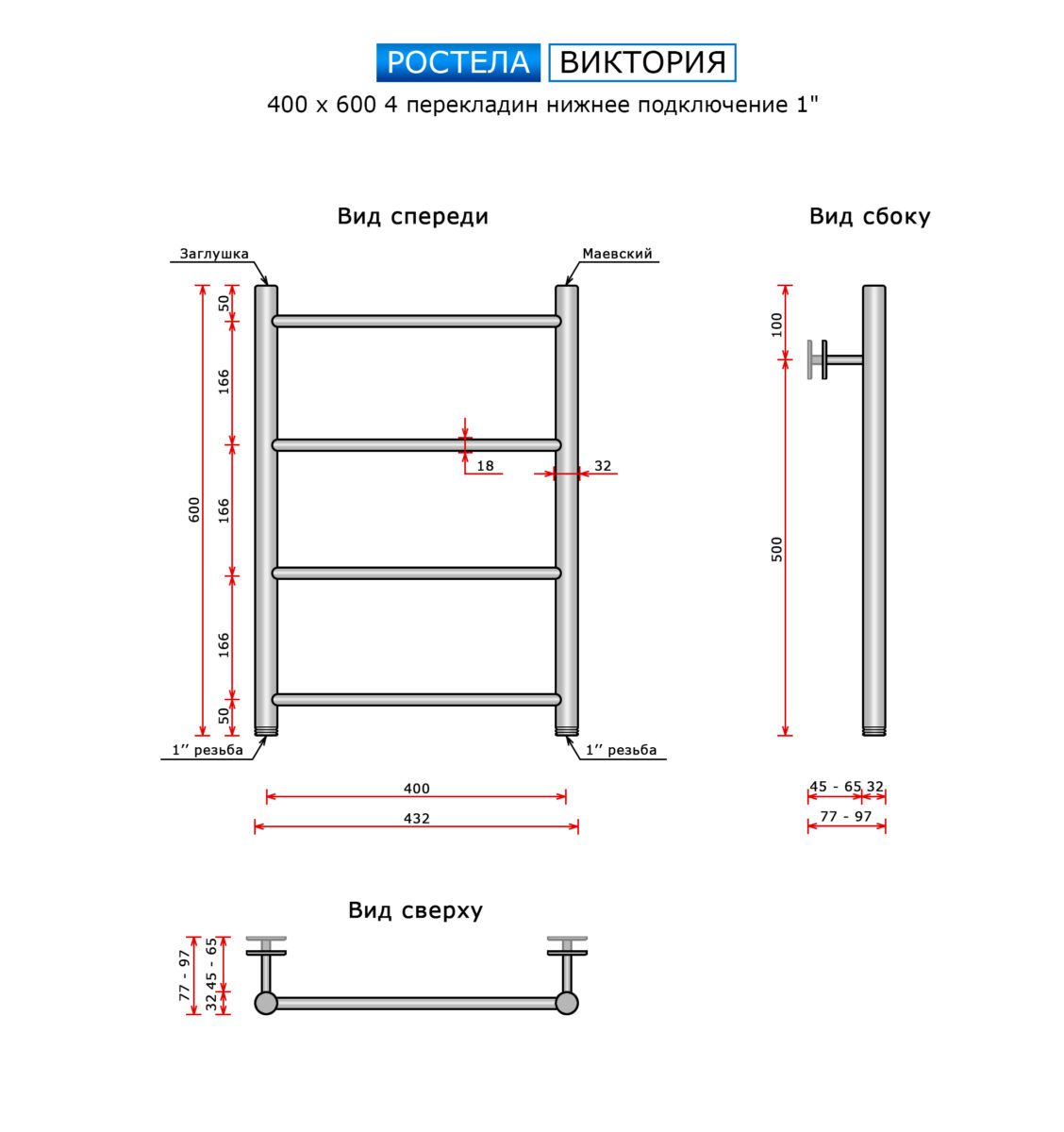 Полотенцесушитель Ростела Виктория (нижн,подв, 1" резьба) 400 x 600 / 4