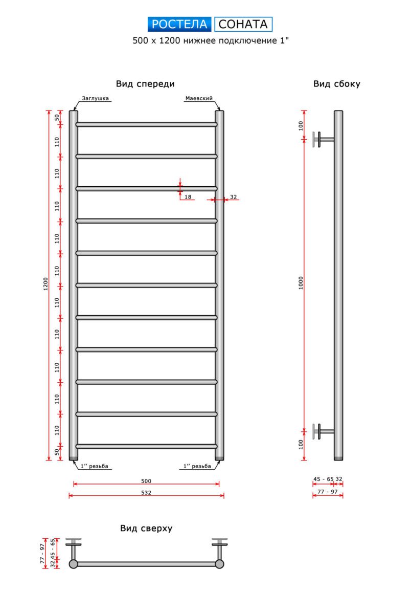 Полотенцесушитель Ростела Виктория (нижн,подв, 1" резьба) 500 x 1200 / 11