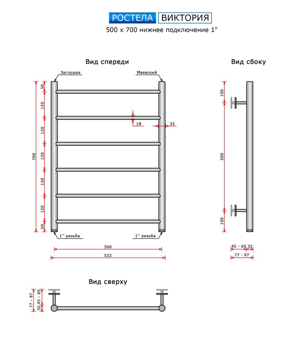 Полотенцесушитель Ростела Виктория (нижн,подв, 1" резьба) 500 x 700 / 6