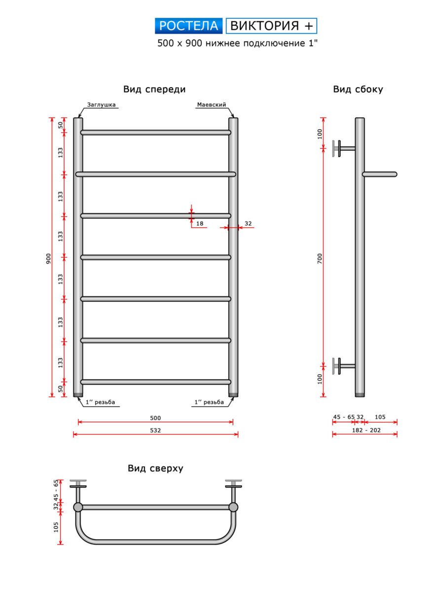 Полотенцесушитель Ростела Виктория + (с пол.,нижн.подв. 1" резьба) 500 x 900 / 7