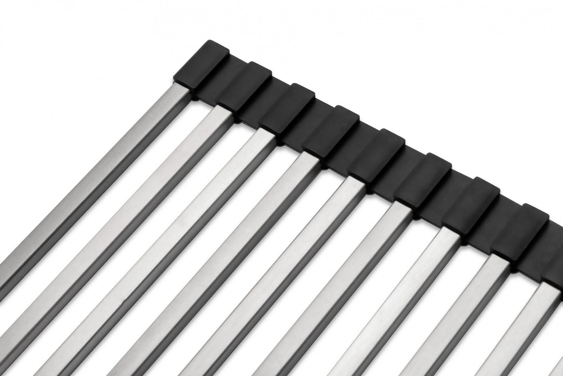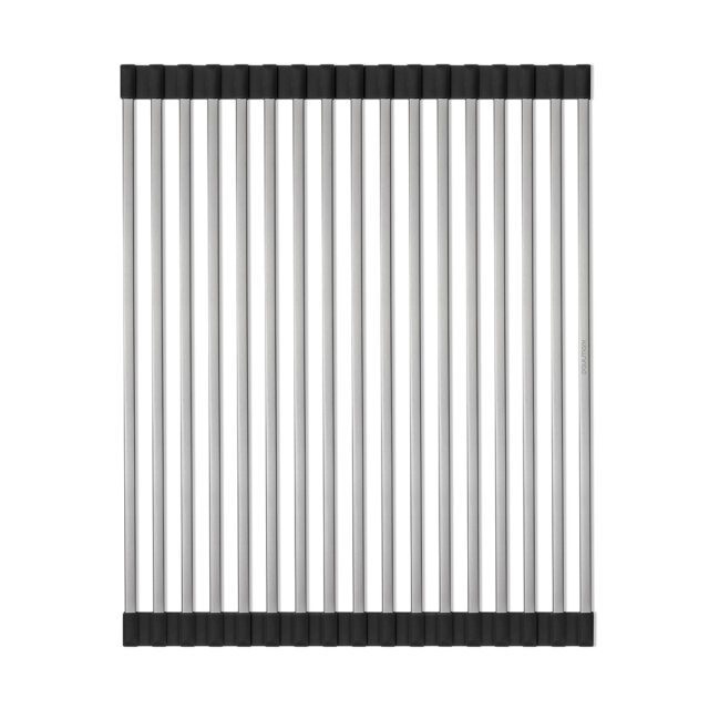 Ролл-мат многофункционален и может быть использован в качестве подставки для горячей посуды, сушилки для овощей и фруктов или коврика для разморозки продуктов. Благодаря двусторонним силиконовым наконечникам, ролл-мат защищает поверхность и может быть размещен на столешнице, крыле мойки или в специальных направляющих чаши кухонной мойки.