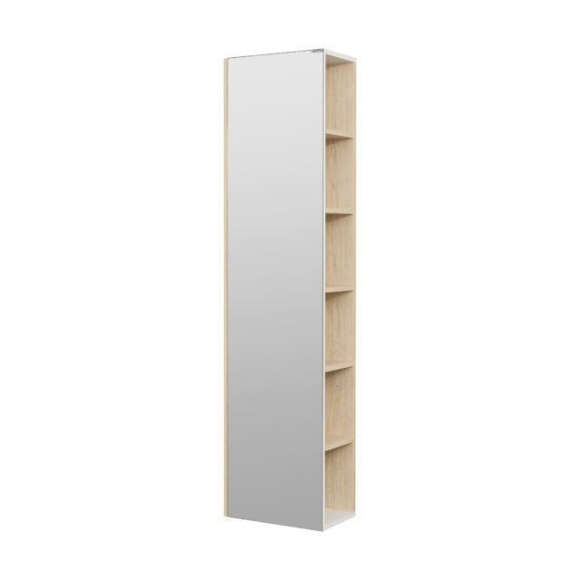 В состав коллекции входит необычный шкаф — пенал. За зеркальной створкой расположены нерегулируемые (верхние и нижние) и 3 регулируемые полочки (по центру), и разделенные перегородкой открытые полочки, таким образом, обеспечивая легкий доступ к открытым полкам без необходимости открывания фасада.