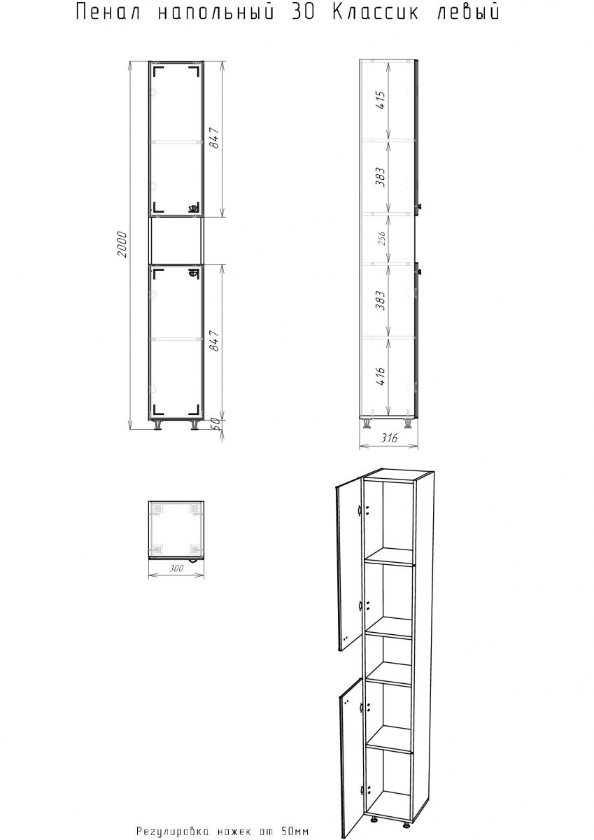 Пенал напольный 30 Классик без ящика левый от Айсберг – это стильное и функциональное решение для хранения посуды и других предметов в вашем доме. Мебель для ванных комнат от Айсберг проходит многоуровневый контроль качества, при производстве используются влагостойкие материалы, что обеспечивает максимальную влагостойкость изделия. Пенал имеет две распашные дверцы, открывающиеся в левую сторону, и две полки внутри. Корпус и фасад изготовлены из ЛДСП и МДФ, покрыты пленкой ПВХ. Конструкция пенала предусматривает 5 секций, что позволяет разместить в нем различные предметы. Особенностью пенала является наличие доводчиков на дверях, которые обеспечивают плавное и бесшумное закрывание. Регулировка ножек позволяет установить пенал на удобной высоте, а петли с доводчиками обеспечивают комфортное использование. Выбирая пенал напольный 30 Классик без ящика левый от Айсберг, вы получаете стильное, функциональное и надежное решение для хранения ваших вещей.