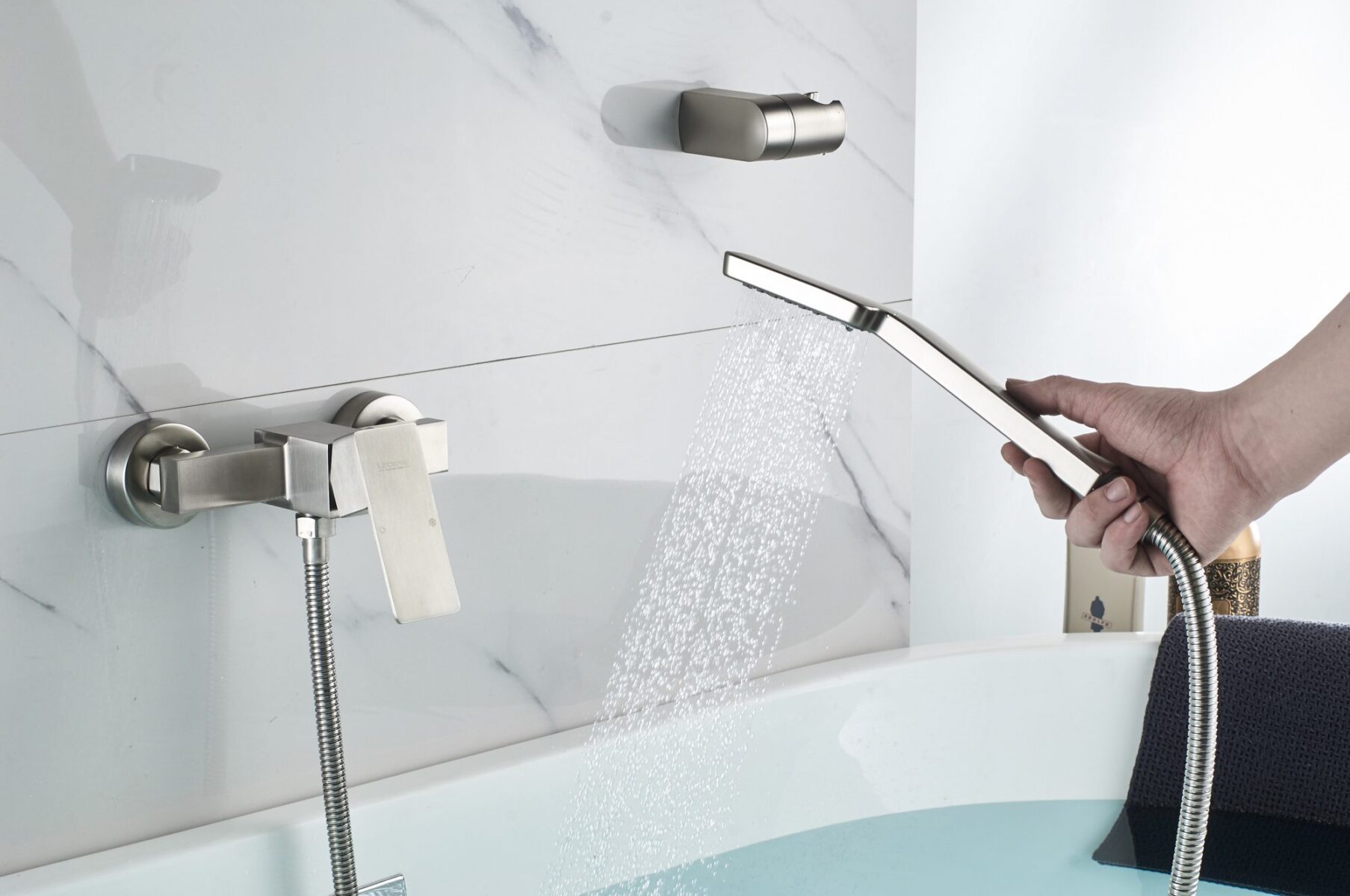 Смеситель; Набор для монтажа; Лейка для душа; Шланг в металлической оплётке 1500 мм; Настенный держатель для лейки