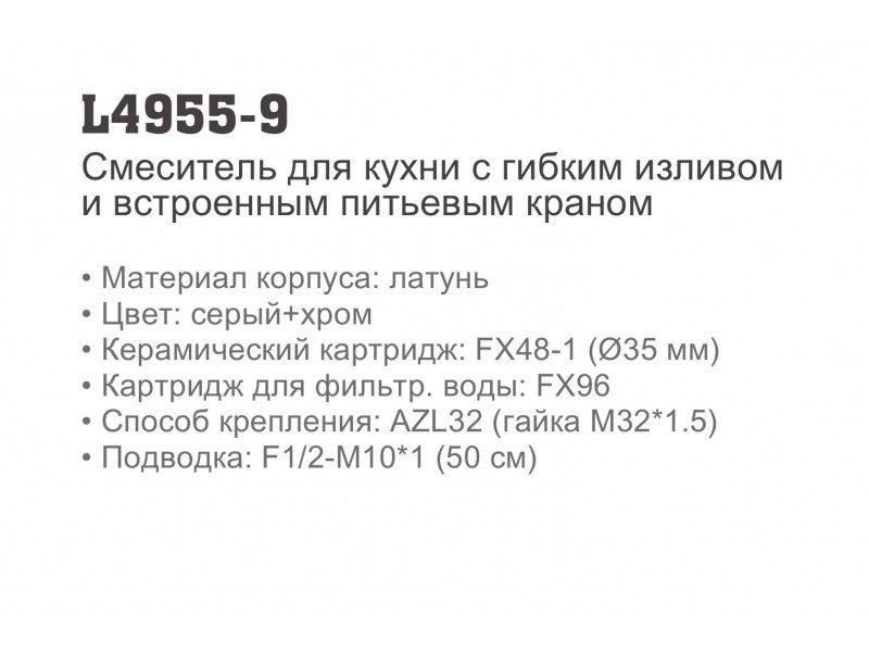 Смеситель для кухни под фильтр Ledeme L4955-9, хром/серый