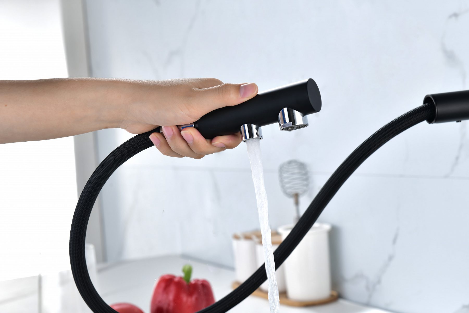 Смеситель оснащен гибким выдвижным изливом из нелойновой оплетки, которая обладает отличной устойчивостью к истиранию и разрушению. Данная техническая особенность расширяет рабочую зону смесителя, позволяя пользоваться им с удобством в больших мойках, мойках с двумя чашами, или наполнять водой ёмкость на столе рядом с мойкой, в том числе питьевой водой.