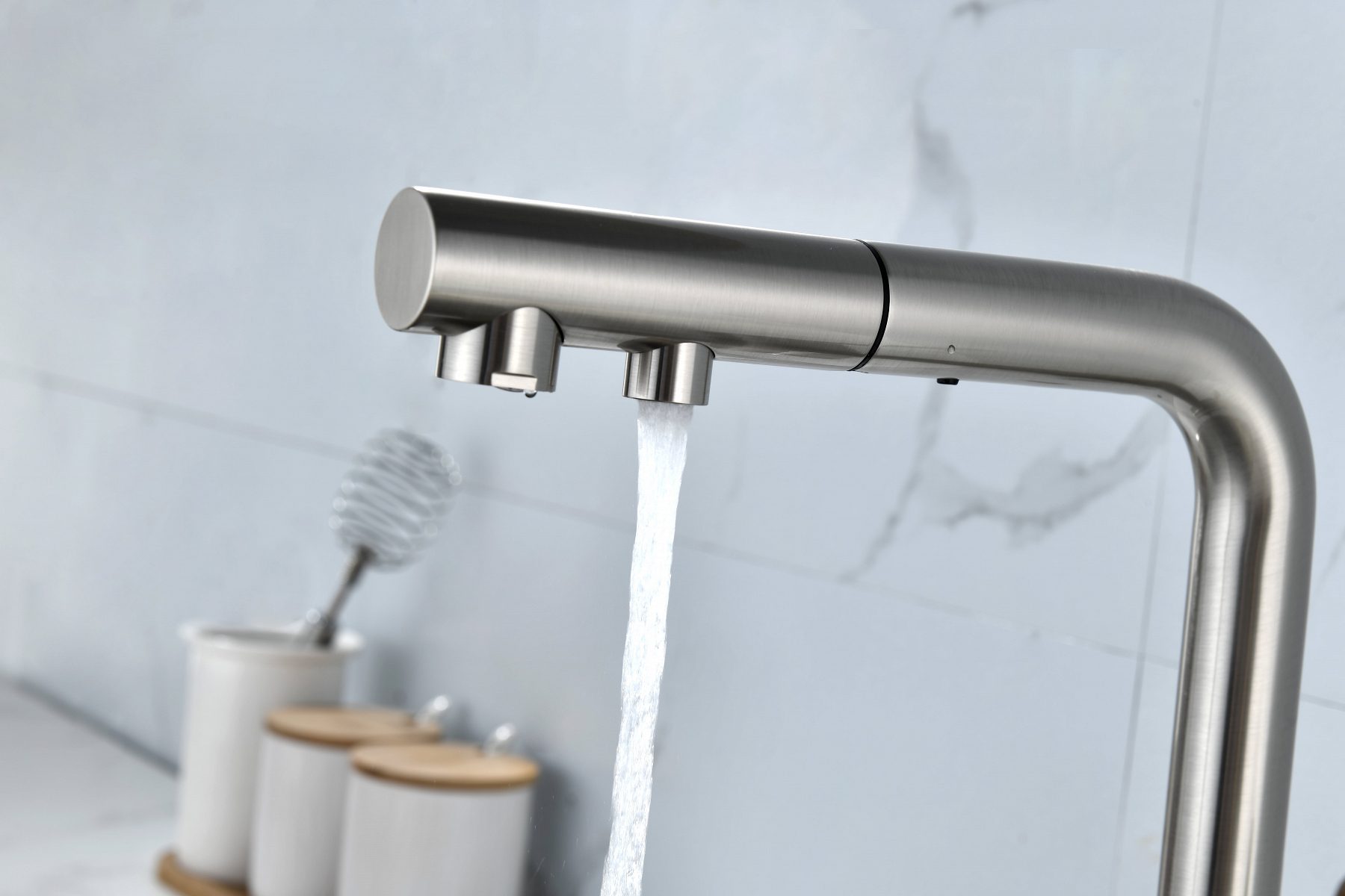 SERPENTINE оснащён функцией TRINKWASSER – излив смесителя имеет встроенный независимый канал для питьевой воды из фильтра, таким образом питьевая и водопроводная вода не смешиваются. Управление питьевой водой осуществляется отдельным рычагом, расположенным слева. Для пуска водопроводной воды используется большой рычаг справа.