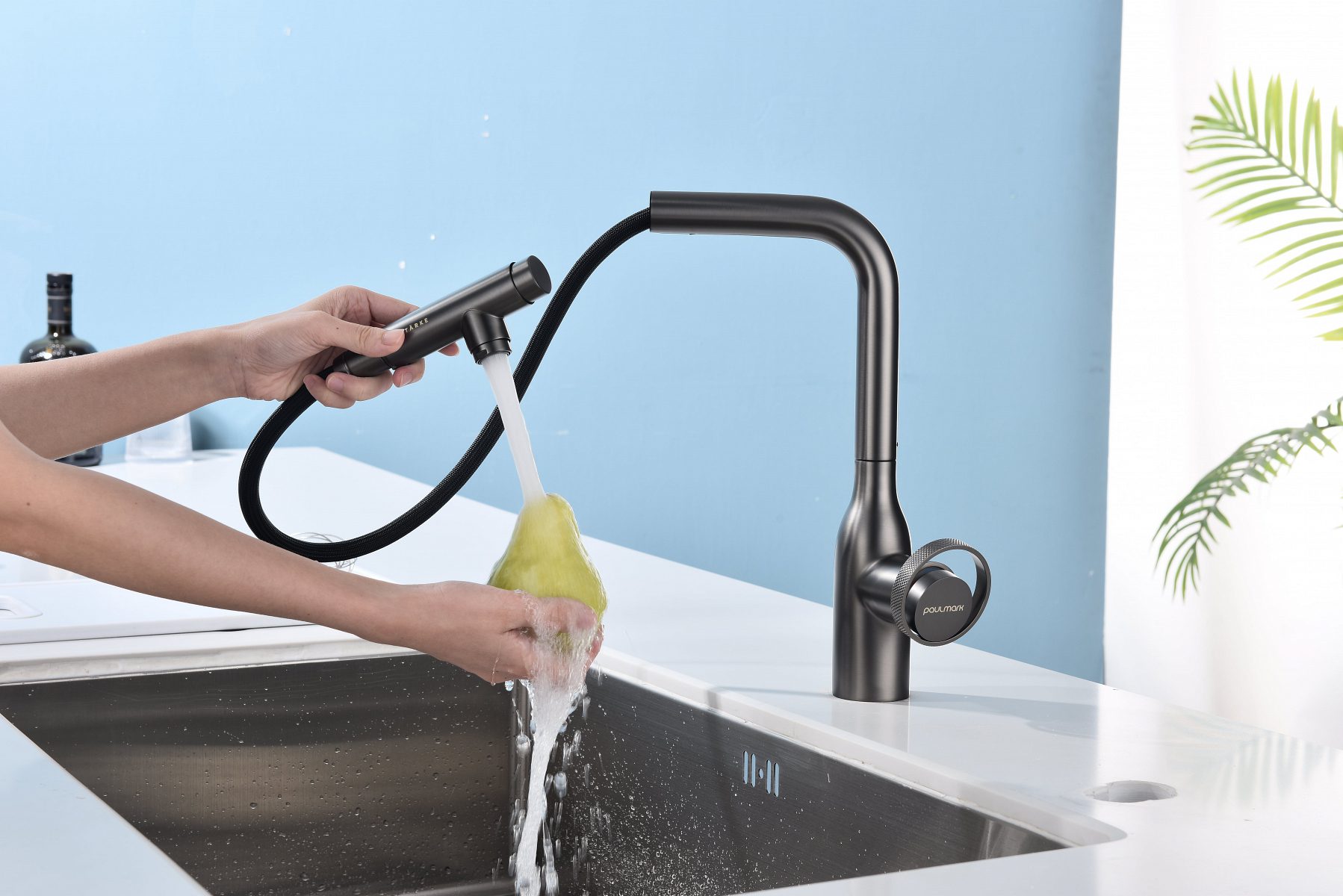 Высокий Г-образный излив с функцией вращения на 360 градусов обеспечивает удобство использования. Выдвижная часть излива способна обеспечить максимально комфортную эксплуатацию и экономный расход воды.