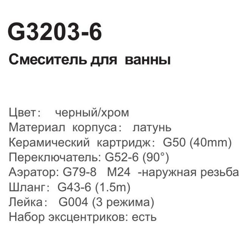 | Комплектация | Аэратор, Душевой гарнитур, Смеситель, Эксцентрики |