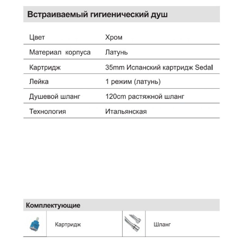 | Комплектация | Комплект креплений, Душевой гарнитур, Смеситель |