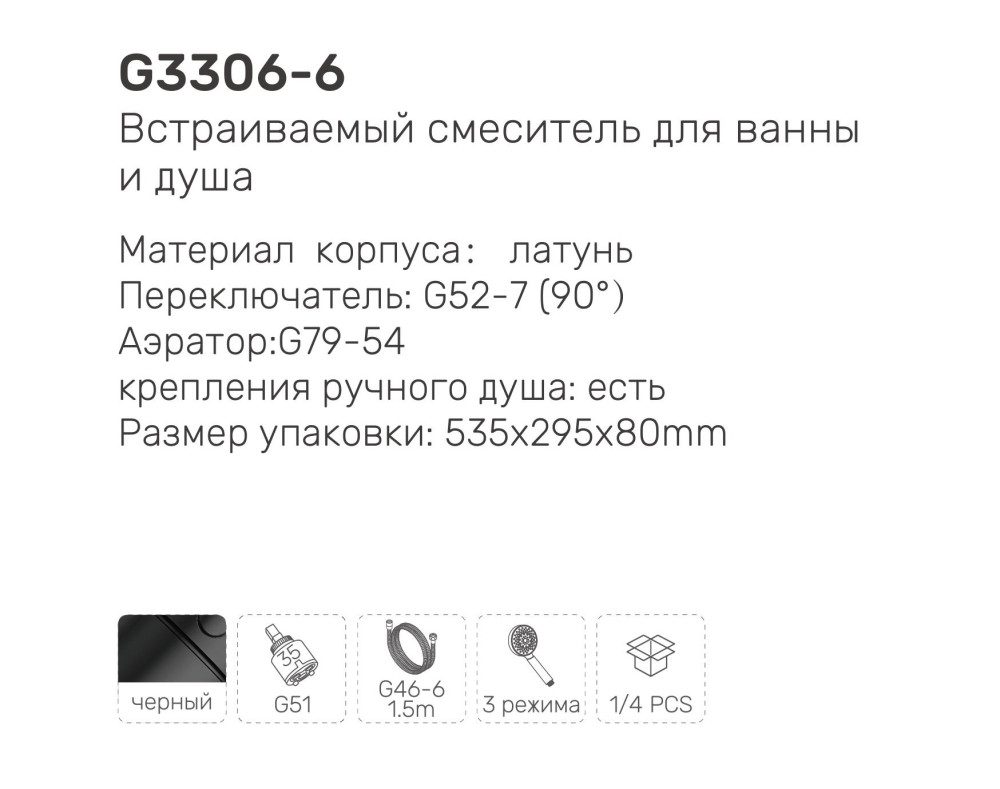 Смеситель скрытого монтажа для ванны Gappo G3306-6, чёрный