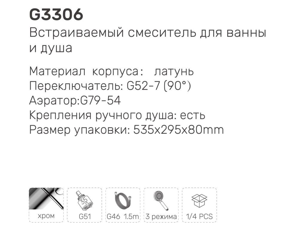 | Комплектация | Комплект креплений, Душевая лейка, Смеситель |