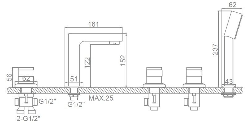| Комплектация | Смеситель (4 ед.), Набор для монтажа, Лейка для душа, Шланг в металлической оплётке 1500 мм, Гибкая подводка |