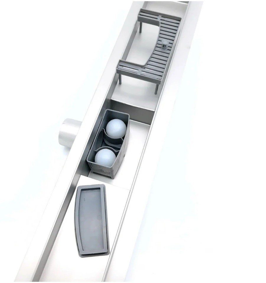 Трап-лоток 70 мм х 450 мм из нержавеющей стали, решетка с круглой ячейкой.