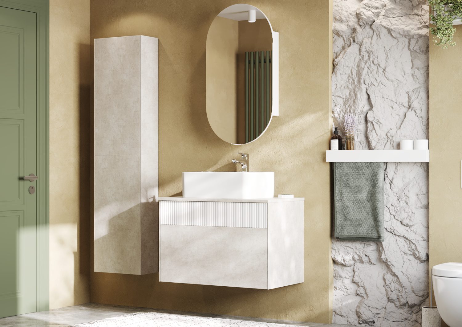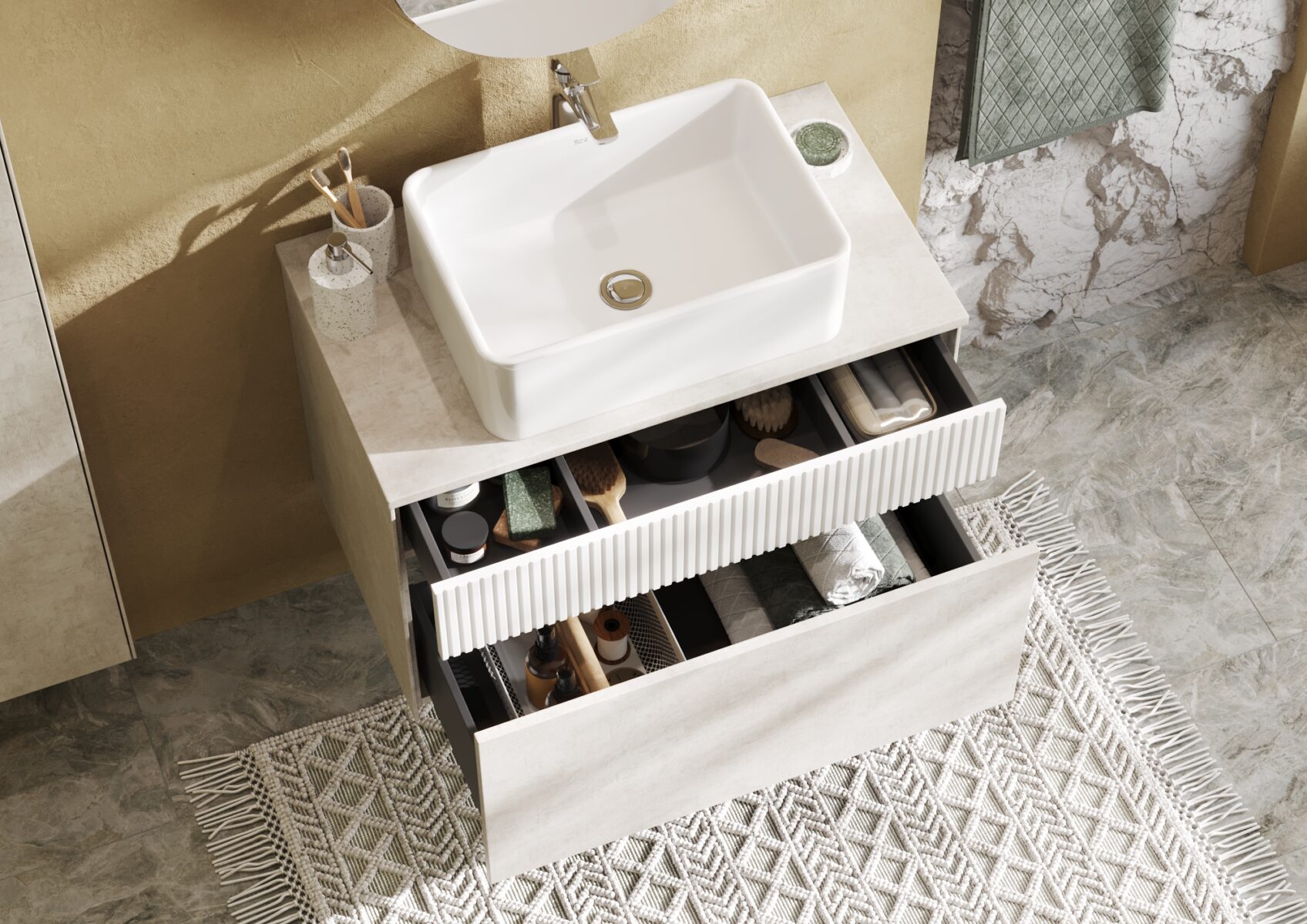 Тумба Марбл 80 функционально состоит из двух вместительных ящиков, оснащенных системой push to open, обеспечивающей надежное, комфортное и бесшумное закрывание. Дополнительно предусмотрены 2 регулируемые планки для внутренней организации пространства. Верхний фасад изделия выполнен из МДФ с реечной фрезеровкой в белой матовой пленке с эффектом soft touch, а нижний фасад и корпус из ламинированной влагостойкой ДСП Слэйт. Верхний и нижний ящики позволяют содержать косметические средства в идеальном порядке. Тумба комплектуется различными по форме накладными раковинами: Santek Одри Soft, Santek Одри Round, Aquaton Лола, Roca Mila круглая и Roca Mila прямоугольная. Раковины продаются отдельно.