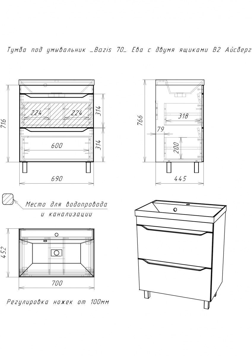 Тумба под умывальник “Bazis 70” Ева с двумя ящиками В2 Айсберг – это сочетание стиля, функциональности и качества.
