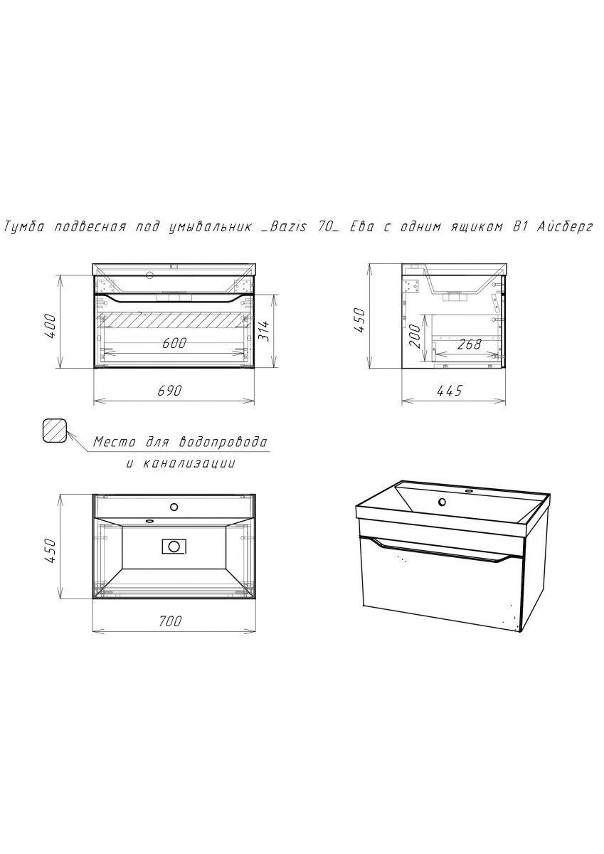 Тумба подвесная под умывальник “Bazis 70” Ева от бренда “Айсберг” – это стильное и функциональное решение для вашей ванной комнаты.