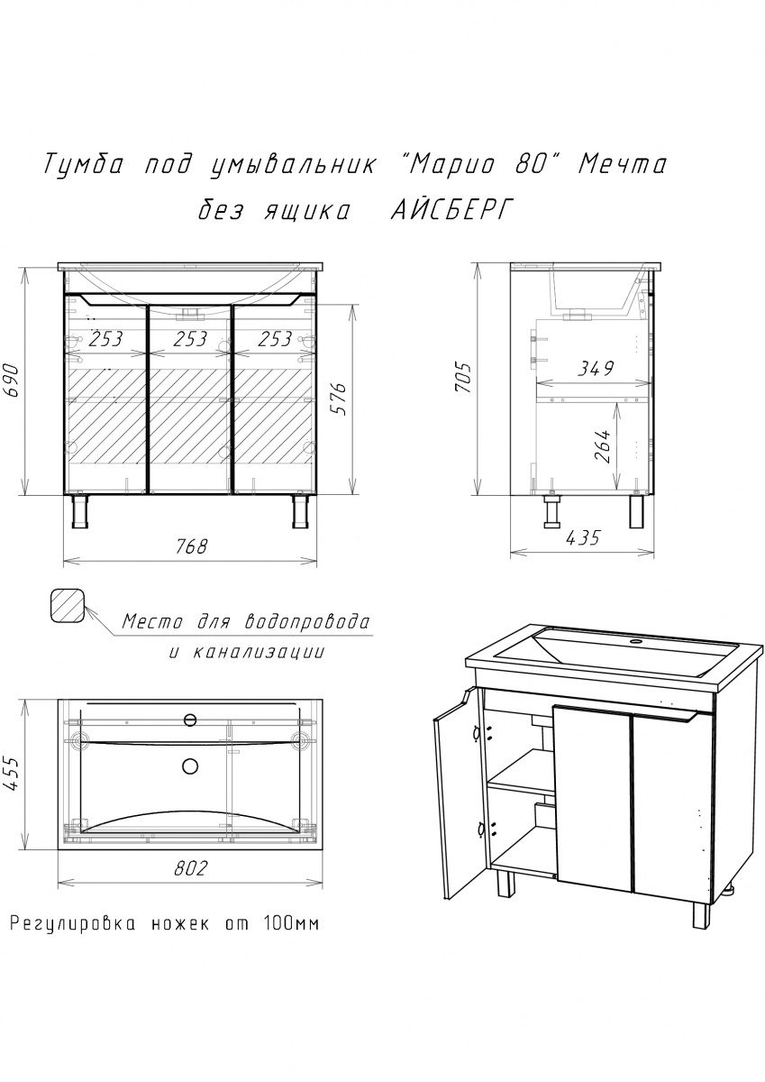 Тумба под умывальник “Марио 80” Мечта без ящика от Айсберг – это стильное и функциональное решение для вашей ванной комнаты. Изготовленная из высококачественных материалов, эта тумба сочетает в себе прочность и долговечность. Корпус и фасад выполнены из ЛДСП и МДФ, покрытых пленкой ПВХ.